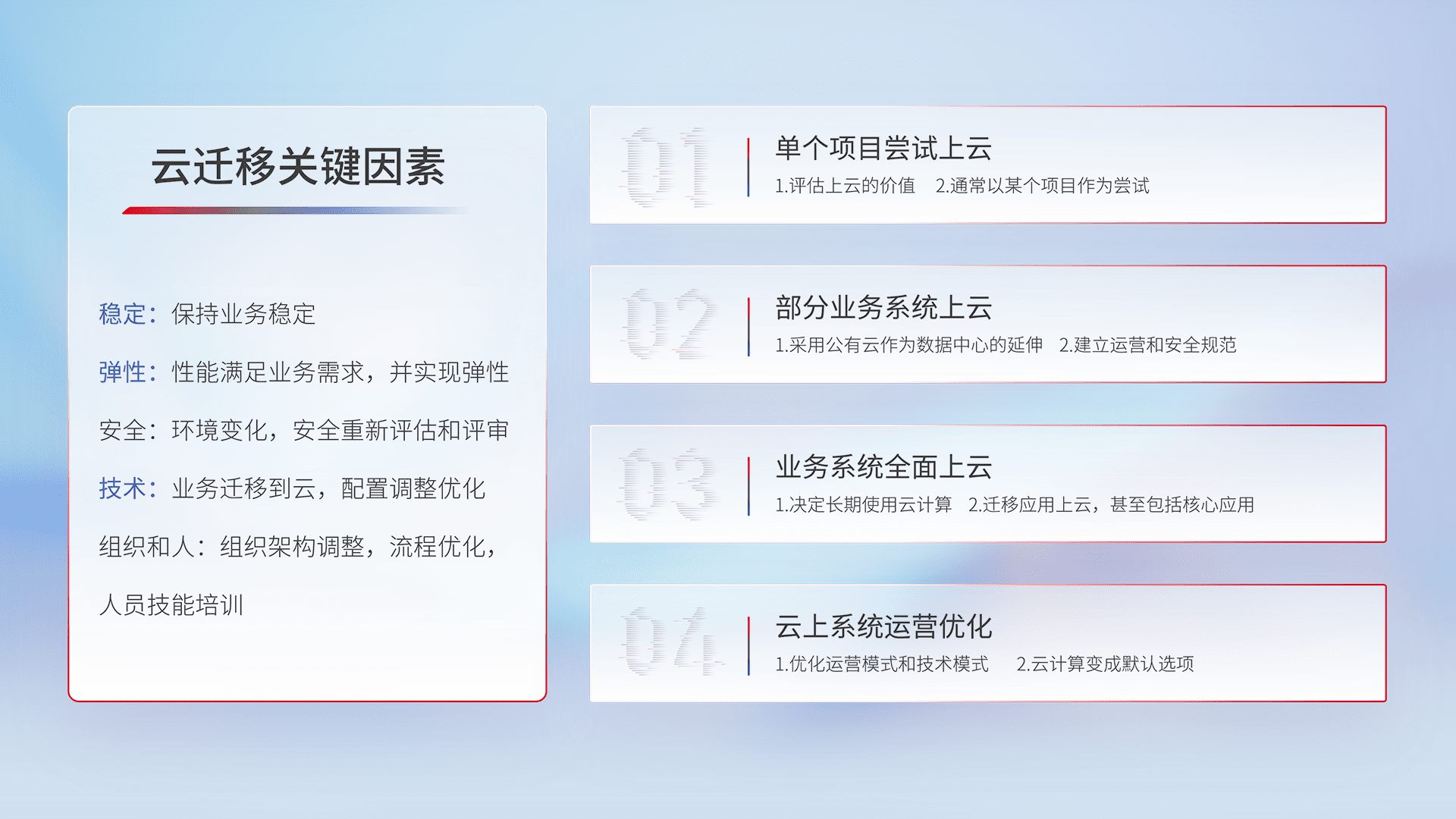 结合实际业务,,,从规划设计、、、、云平台选型、、、云原生改造、、数据迁移、、集成交付,,,迁移全过程为客户识别最佳上云路径,,做好风险识别管理,,,,设计网络架构、、身份权限、、、安全审计合规、、操作审计、、、、日志审计、、监控告警策略、、、多站点容灾设计等,,,,对云上基础设施进行整体规划,,,,提升IT治理水平,,,,以满足弹性、、、、高可用、、、高性能的需求。。。。