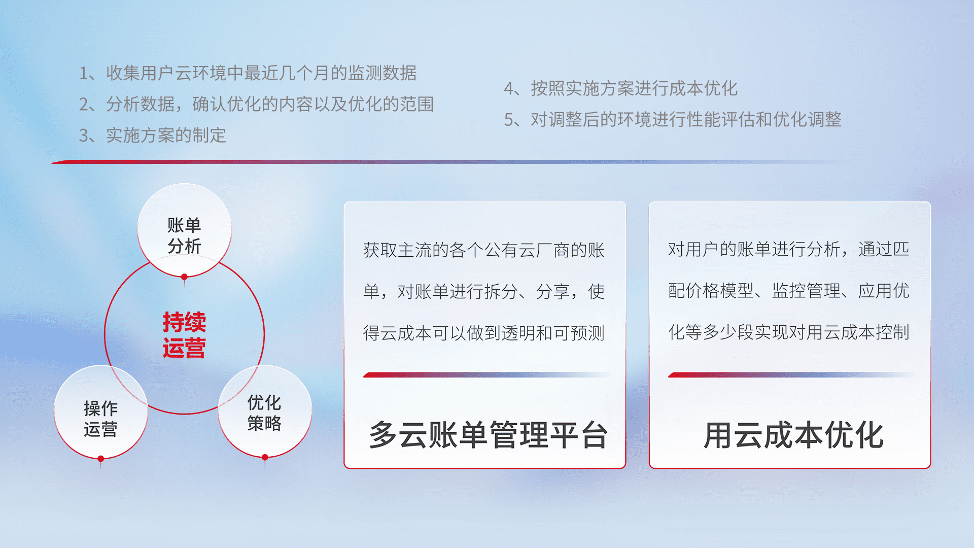 通过多云纳管,,以统一的资源数据模型把客户的云资源进行抽象和封装,,,,进而实现对多云资源的统一操作,,保障云资源管理的可靠性、、、稳定性与可用性。。。量身定制化运维内容,,配置、、、开发运维、、、、补丁管理、、、备份、、、监控、、、、认证和访问管理、、审计和日常巡检等,,,保障在用云过程中的可靠度,,,稳定度以及高可用率。。。